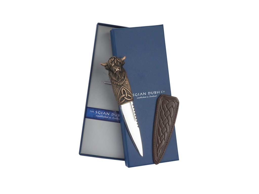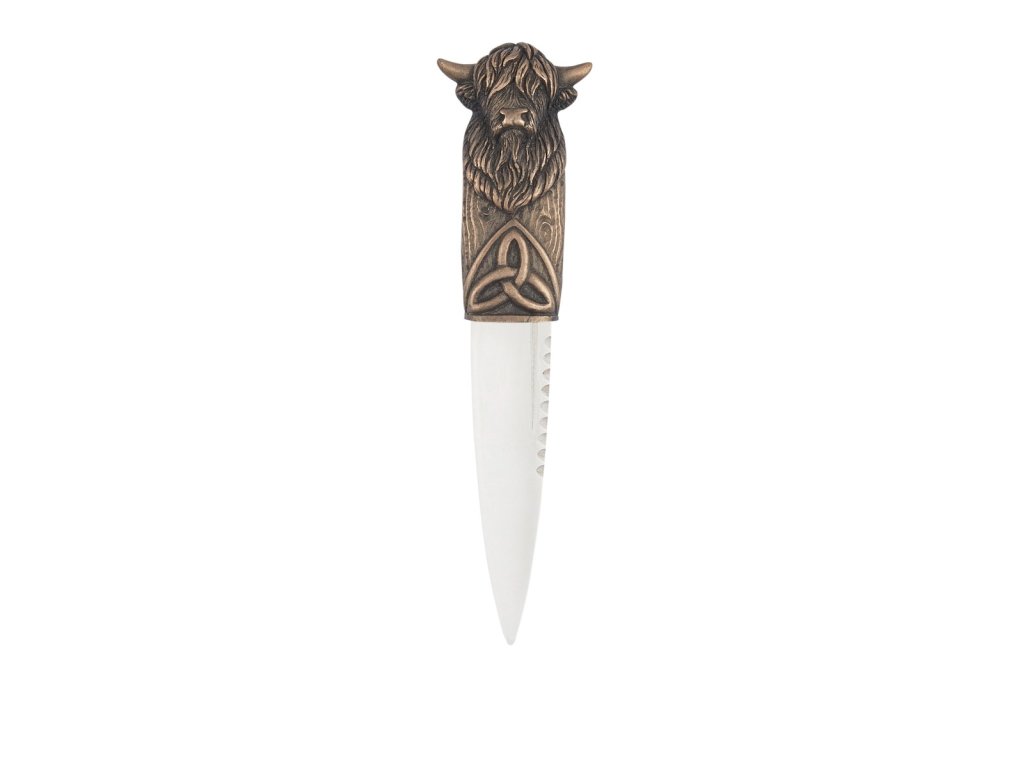 Keltská dýka - Sgian Dubh s rukojetí z bronzové pryskyřice, v hnědém koženém pouzdře se vzorem.