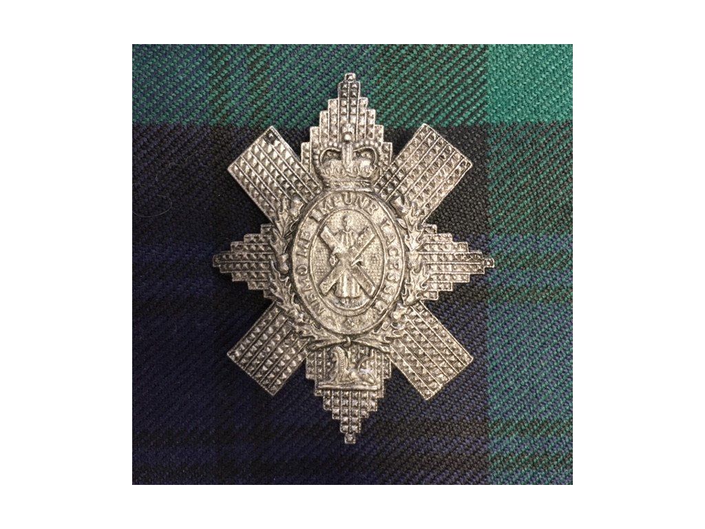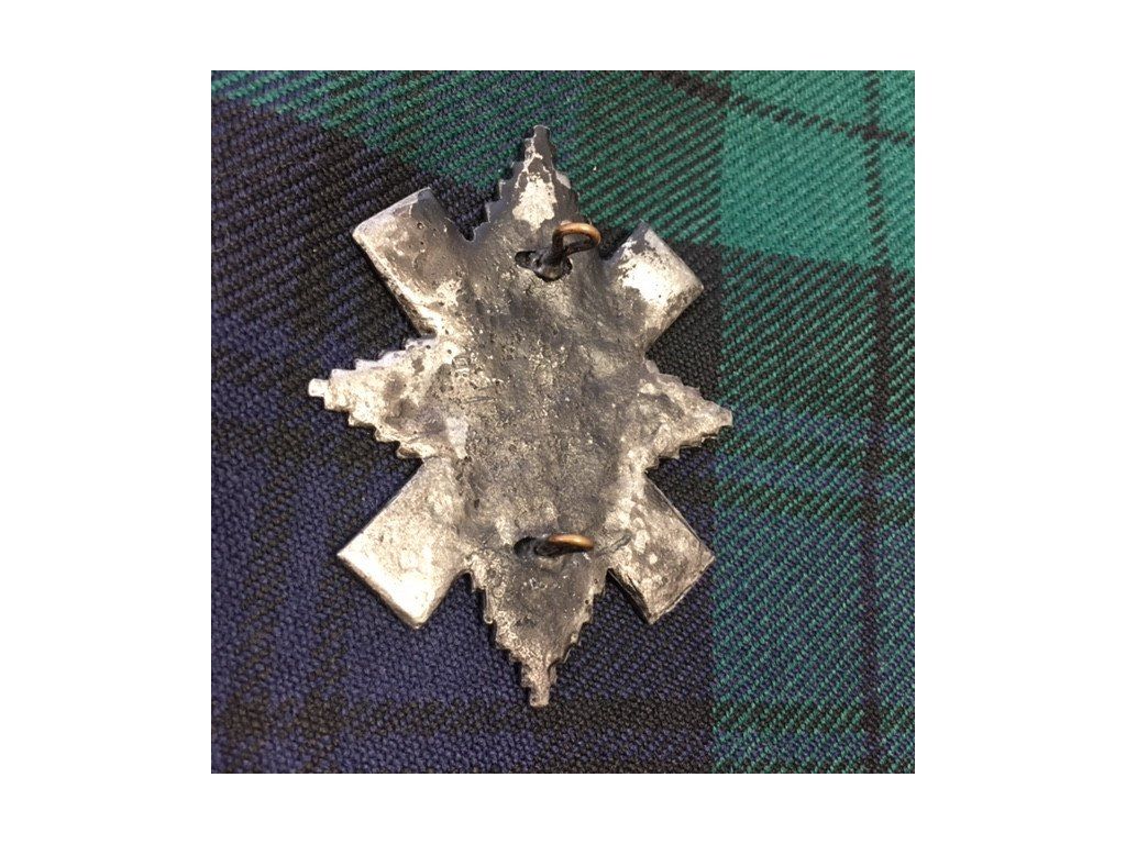 Badge for a glengarry - Black Watch regiment - motto "Nemo me impune lacessit". It has two loops on the back for attaching to the cap - you need to punch holes in the backing and thread a wire through to attach (wire not included).