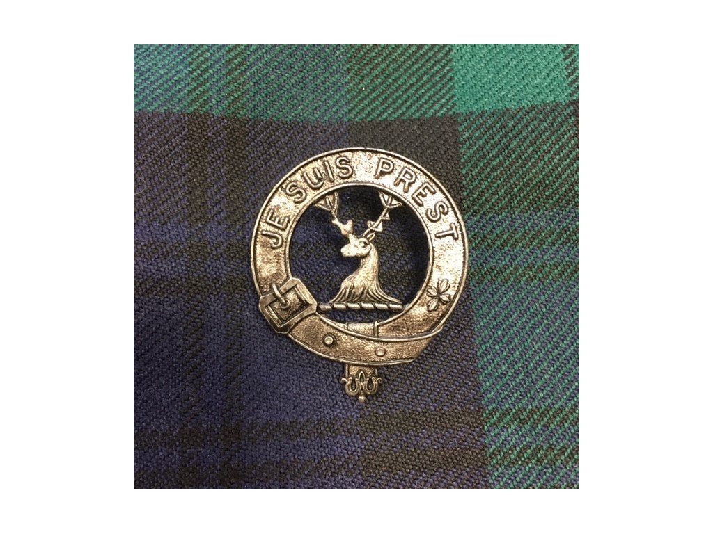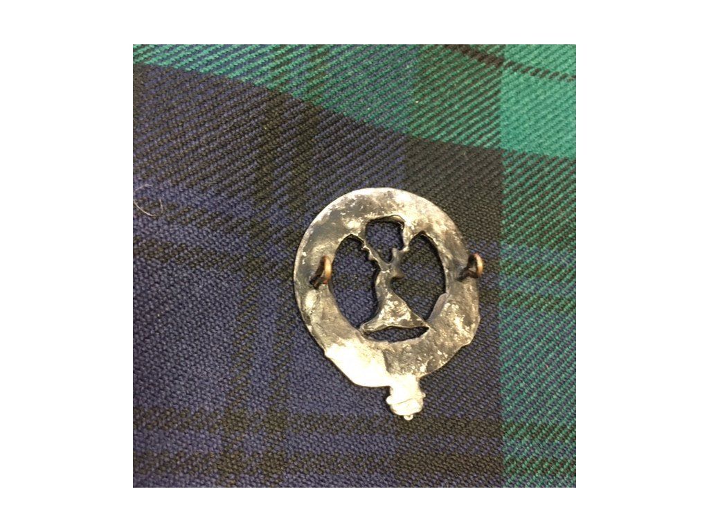 Glengarry badge - Fraser clan - Lovat Scouts regiment - "Je suis prest" logo. It has two eyelets on the back for attaching to the cap - you need to punch holes in the backing and thread a wire through to attach (wire not included).