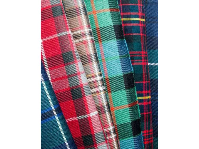 Tartan od renomovaného průmyslového výrobce, o váze 240 g/m2, šíře cca 145 cm, ideální pro lehké (například taneční) oblečení či doplňky. Materiál: 100 % vlna.